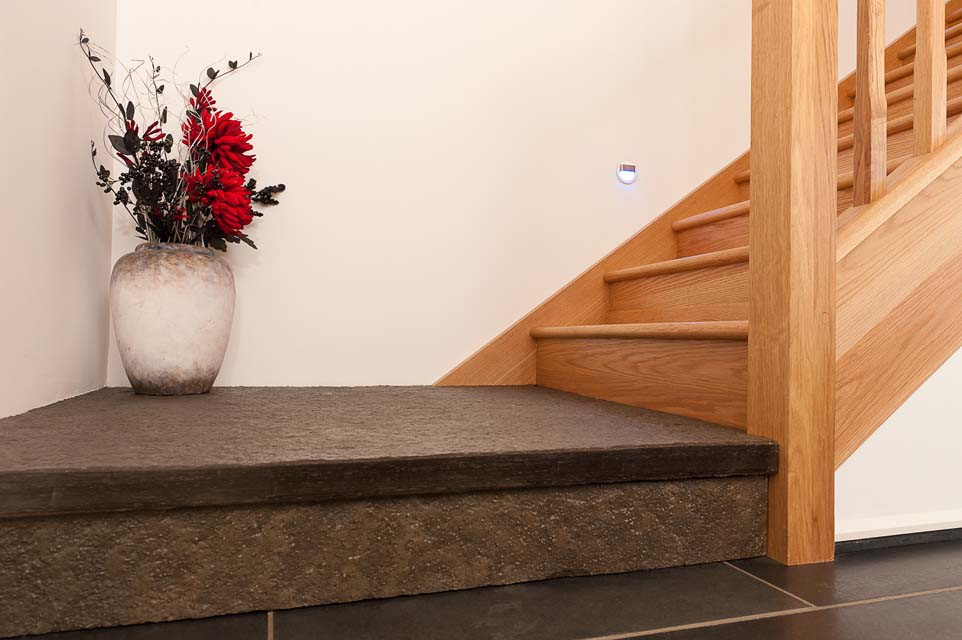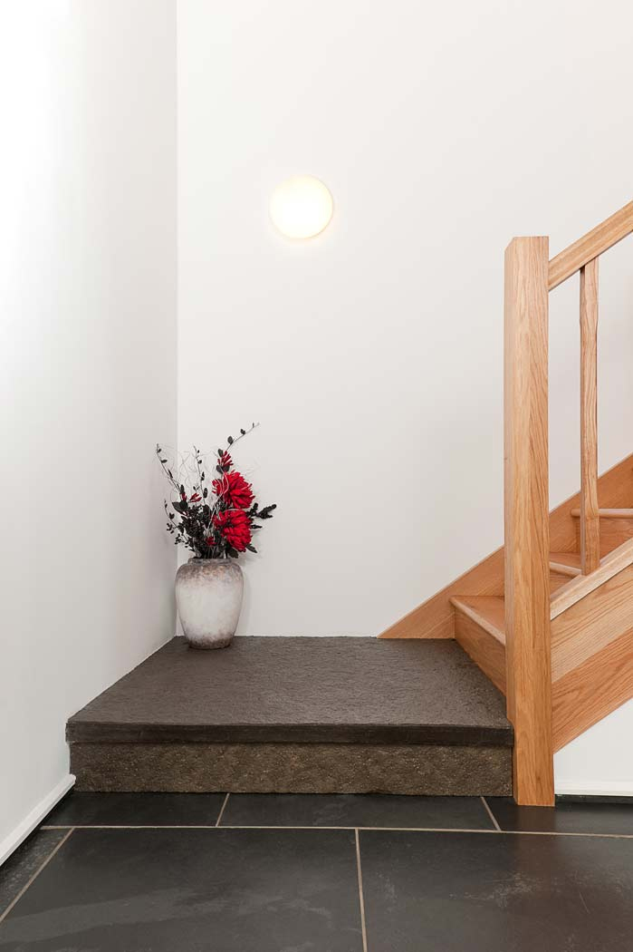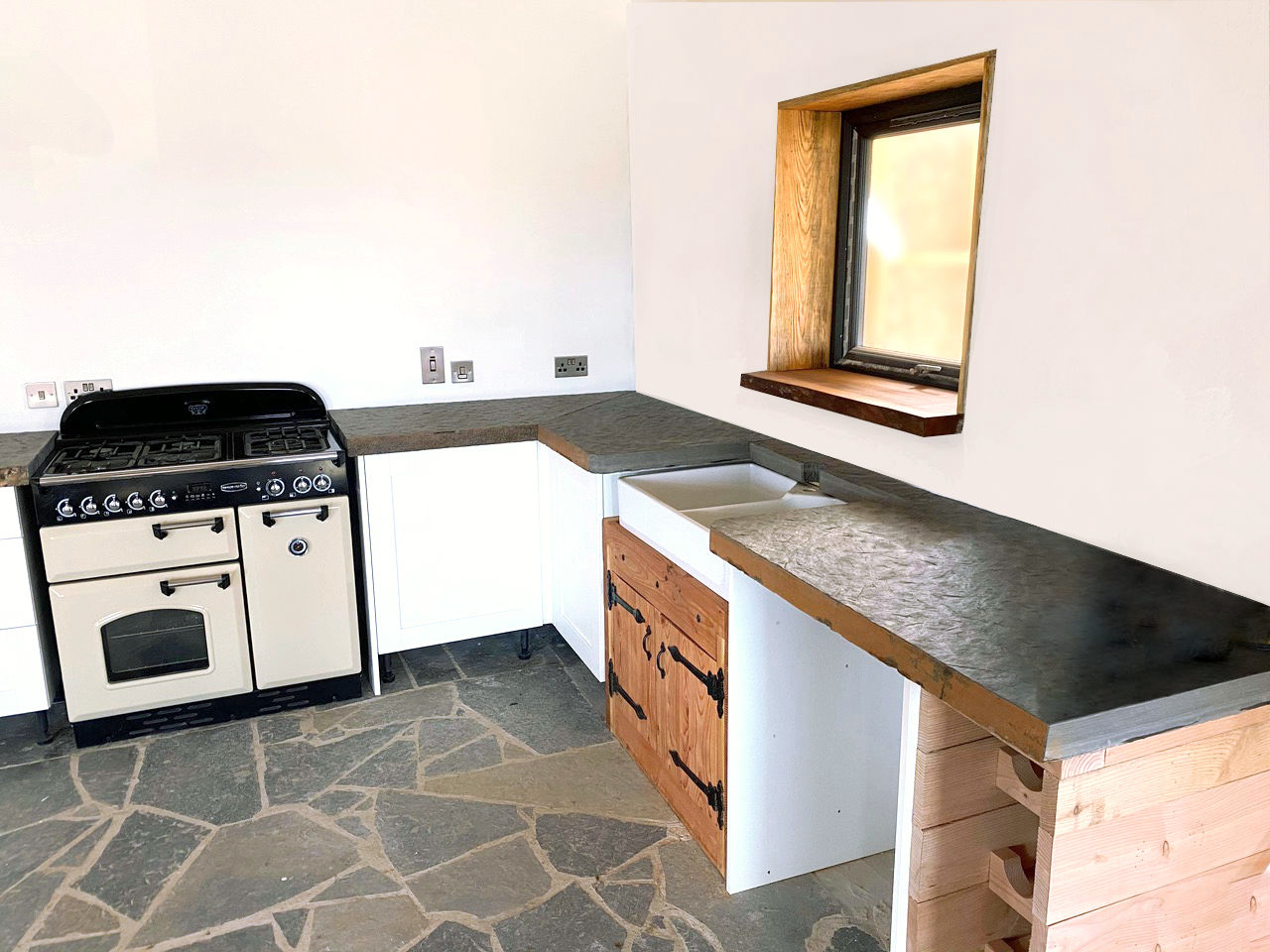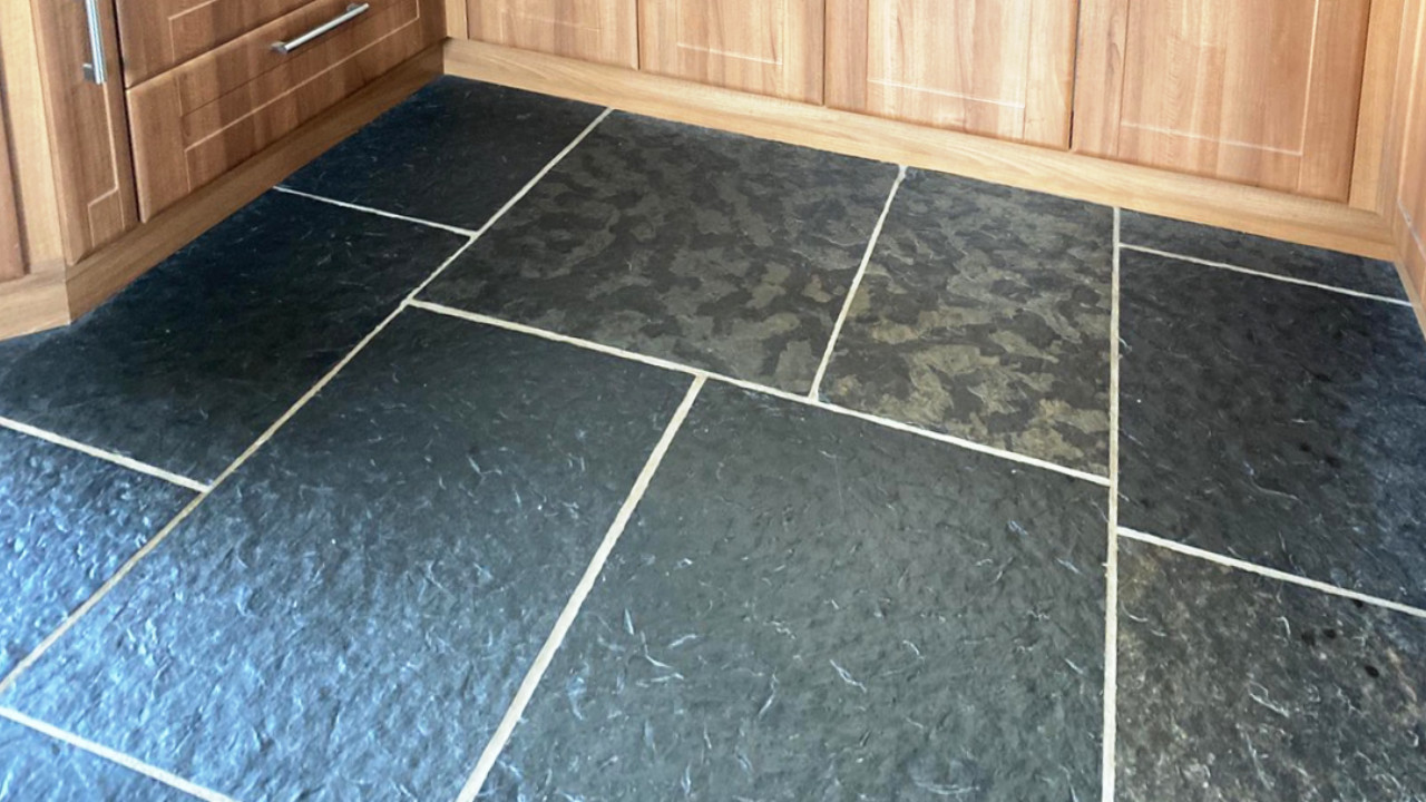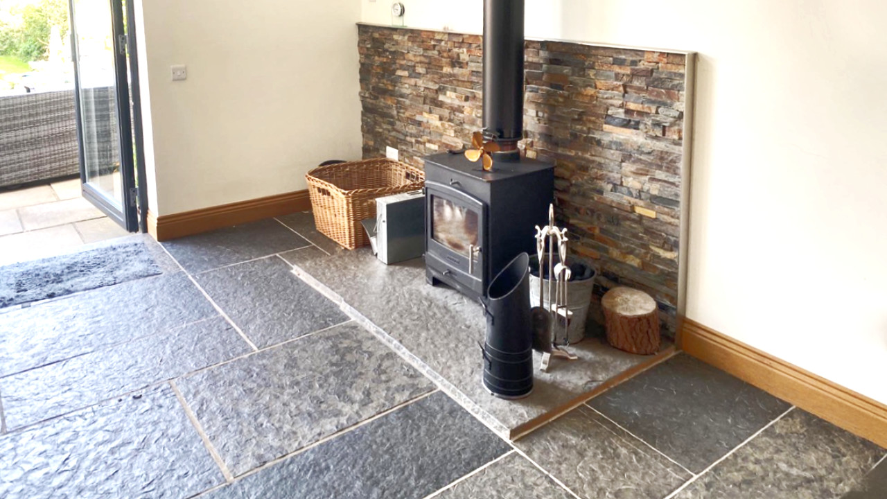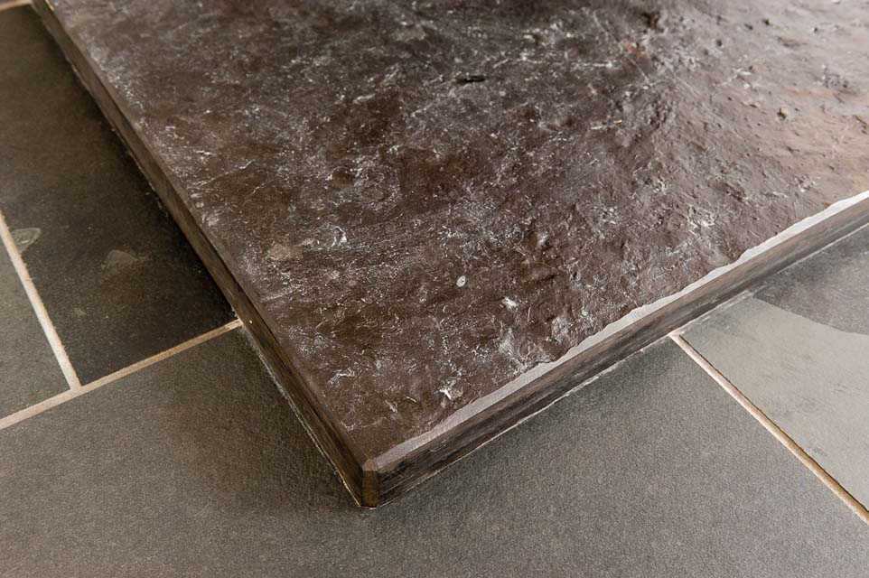 close-up of dressed edges, 35mm thick dark, riven Caithness slate hearth