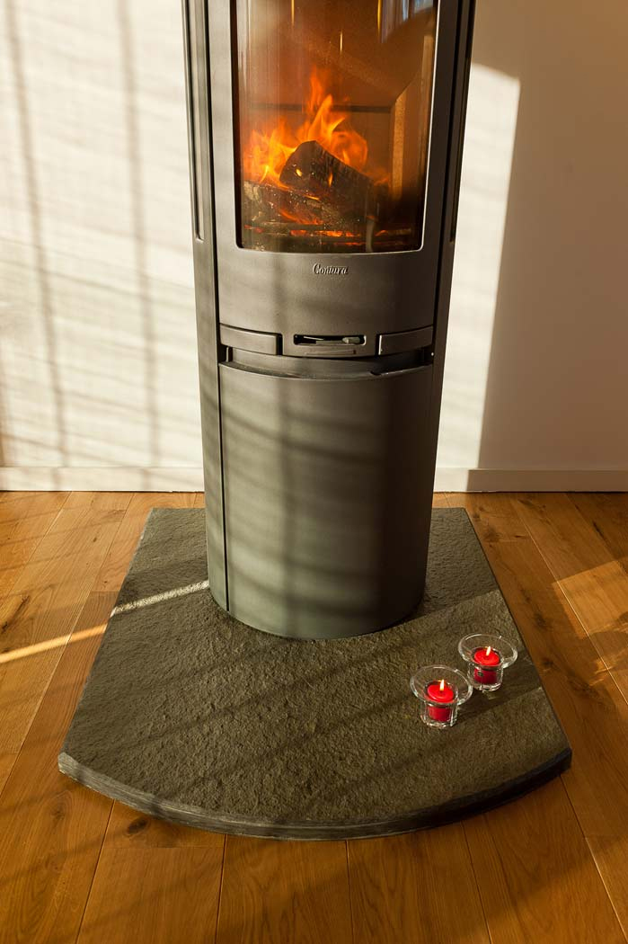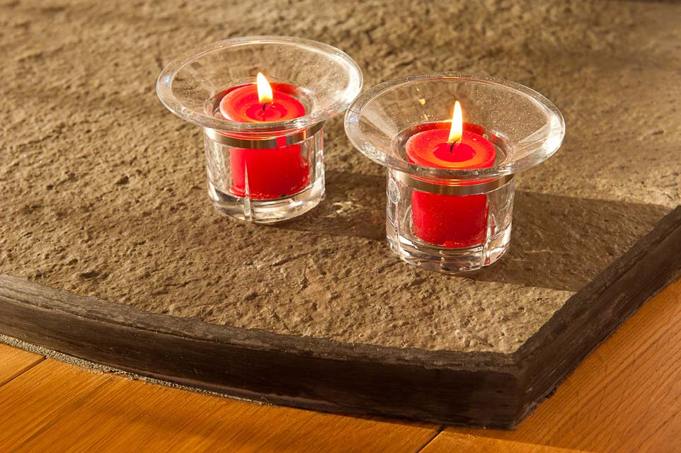 dark, riven Caithness slate free-standing square hearth with dressed front edge